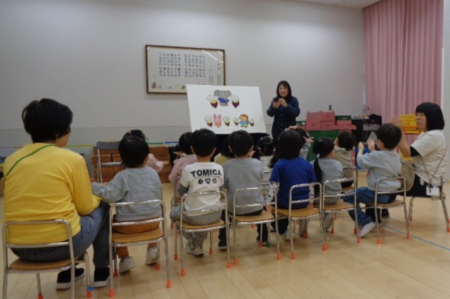 季節の歌「どんぐりころころ」や手遊び「やきいもグーチーパー」を歌ったり、「北風と太陽」やブラックライト「子ぎつねこんこん」を聞いたりして、楽しみました。