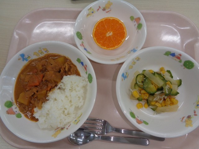 12月23日(火)献立名:ごはん・さつま芋カレー・大根としらすのサラダ・くだもの(みかん)・牛乳