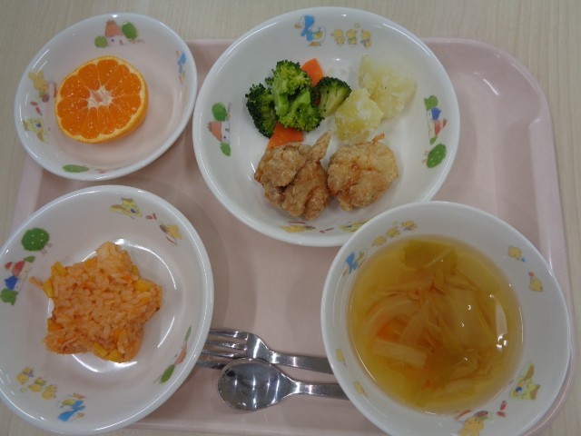 12月24日(水)の給食 公開日 2025/12/24 更新日 2025/12/24 今日の給食 12月24日(水)献立名:ケチャップライス・鶏のから揚げ・ブロッコリーのサラダ・こふき芋・野菜スープ・くだもの(みかん)・牛乳