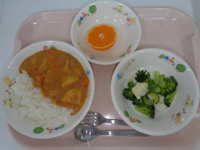 1月14日(水)献立名:ごはん・ポークカレー・ブロッコリーとカリフラワーのサラダ・くだもの(みかん)・牛乳