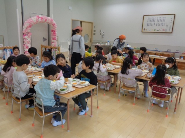 5歳児ひまわり組と4歳児ばら組で、にこにこランチをしました。