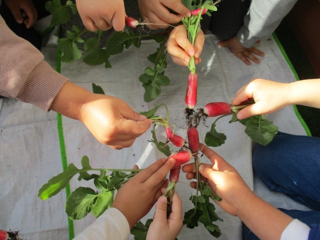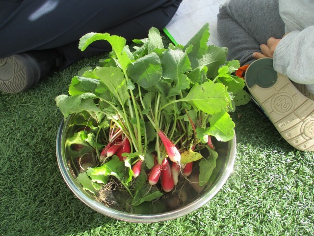 3歳児ちゅうりっぷ組が種まきをして育ててきた二十日大根を収穫しました。