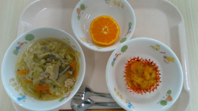 1月16日(金)献立名:タンメン・かぼちゃのチーズ焼き・くだもの(みかん)・牛乳
