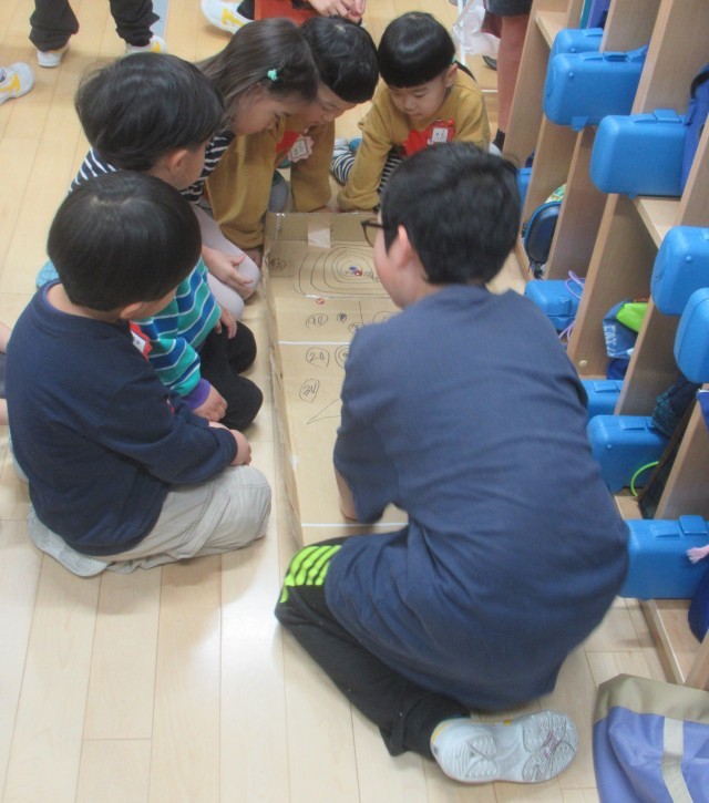 こま、けん玉、だるま落とし、カルタ、メンコ、お手玉など10種類の昔遊びのコーナーがあり、小学生から遊び方やコツなどを優しく教えてもらいました。園児たちは、「もう少しで出来そうだった」「けん玉が楽しかった」など笑顔いっぱいの交流となり、小学生への憧れや親しみをもつことができました。