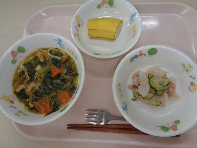 1月21日(水)献立名:カレーうどん・かぶとツナのサラダ・くだもの(バナナ)・牛乳