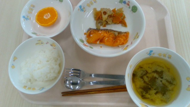 2月2日(月)献立名:ごはん・鮭の塩焼き・れんこんのきんぴら・みそ汁・くだもの(みかん)・牛乳