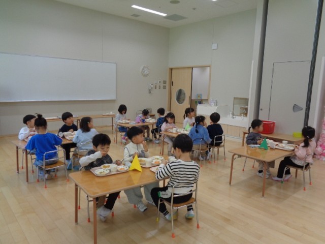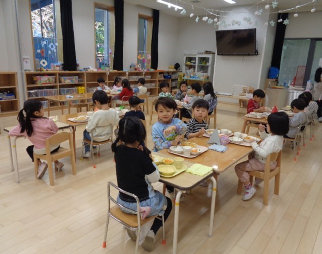 同じグループの5歳児ひまわり組と4歳児ばら組の友達が迎えに来てくれて、オープンルームとわくわくルームの2か所に分かれ、給食を食べました。