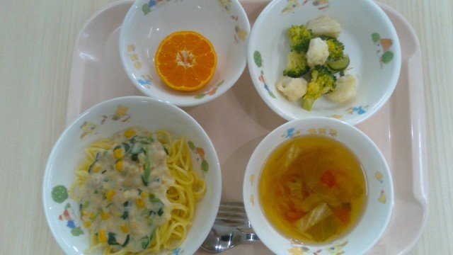 2月6日(金)献立名:鶏肉のクリームスパゲッティ・ブロッコリーとカリフラワーのサラダ・レタスとトマトのスープ・くだもの(みかん)・牛乳