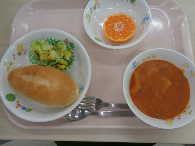2月9日(月)献立名:ソフトフランスパン・ビーフシチュー・フレンチサラダ・くだもの(みかん)・牛乳