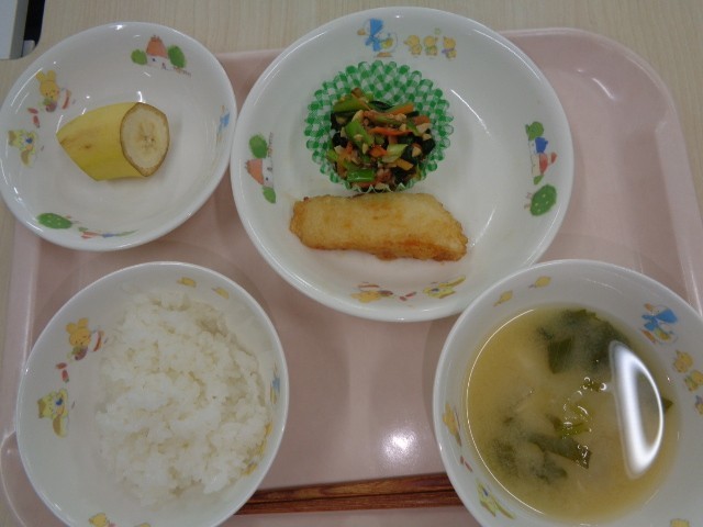 2月12日(木)献立名:ごはん・白身魚のかば焼き・小松菜の納豆あえ・みそ汁・くだもの(バナナ)・牛乳
