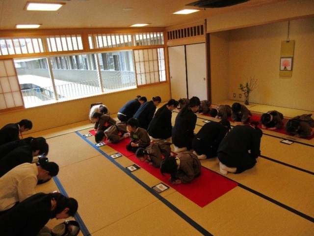 3歳(ちゅうりっぷ組)の時から教わっていた、お茶の作法の総まとめとしてお茶会を開きました。保護者の方にも参加していただき、素敵な時間を過ごしました。園長から「おしるし」を渡しました。(場所:小学校5階 茶室)