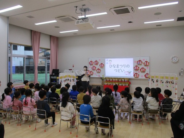 3月3日ひなまつりのつどい 公開日 2026/03/03 更新日 2026/03/03 できごと 皆で作ったひな人形を飾り、ひな祭りのお話を聞きました。ひな人形を見ながらつくった個性あるれる人形がならびました。