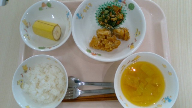 3月11日(水)献立名:ごはん・鶏の唐揚げ・あしたばの納豆あえ・みそ汁・くだもの(バナナ)・牛乳