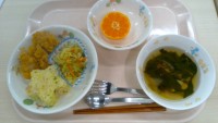 2月17日(火)献立名:ミルクパン・ハンバーグ・大豆のサラダ・オニオンスープ・く...