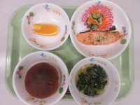 鮭ご飯、じゃが芋のそぼろ煮、ほうれん草と菊のサラダ、すまし汁、バナナ