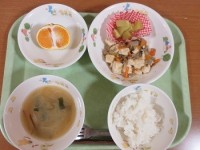 ごはん、豆腐の肉野菜あん、さつま芋の甘煮、みそ汁、みかん