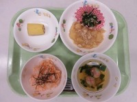 あけぼのごはん、豚肉と高野豆腐の炒め煮、大根ときゅうりの和風サラダ、春雨とチンゲ...