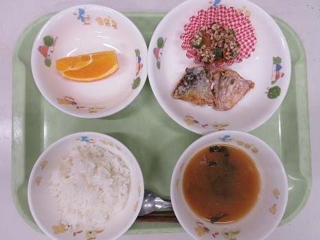 ごはん、鯖の竜田揚げ、オクラの納豆和え、なめこ汁、オレンジ