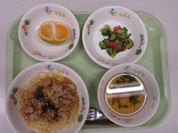 きのこの和風スパゲッティ、ブロッコリーとトマトのサラダ、かぶのスープ、みかん、牛乳