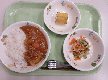 ごはん、ポークカレー、切干大根とツナのサラダ、牛乳、バナナ