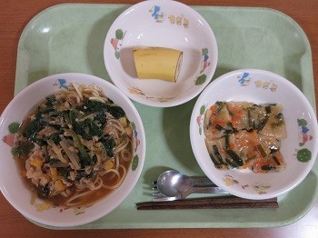コーンもやし味噌ラーメン、米粉のチヂミ、バナナ、牛乳