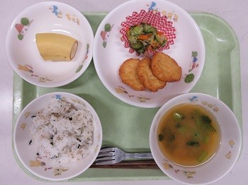 わかめごはん、豆腐の落とし揚げ、白菜ときゅうりの和風サラダ、みそ汁、バナナ