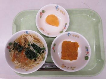 カレーうどん、かぼちゃのチーズ焼き、柿、牛乳