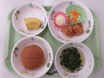 黒糖パン、鶏の唐揚げ、コーンのサラダ、マッシュポテト、野菜スープ、バナナ、牛乳