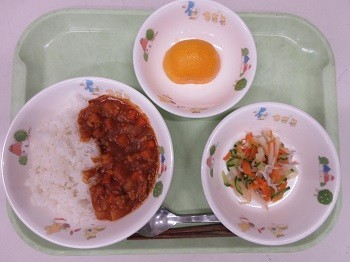 ごはん、キーマカレー、大根としらすのサラダ、みかん、牛乳