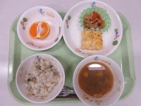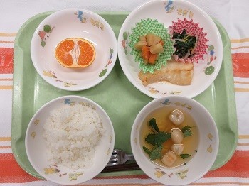 ごはん、白身魚の照り焼き、ほうれん草と菊のサラダ、里芋と人参のみそ煮、すまし汁、みかん