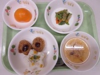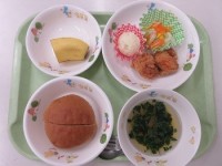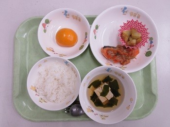 ごはん、鮭のちゃんちゃん焼き、さつまいもの甘煮、すまし汁、みかん