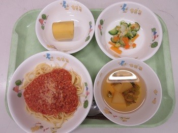 スパゲッティミートソース、白菜と人参のサラダ、かぶのスープ、バナナ、牛乳
