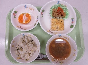 菜めし、ぎせい豆腐、れんこんと人参のきんぴら、なめこ汁、みかん
