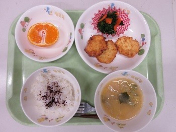 ゆかりごはん、豆腐の落し揚げ、ほうれん草のゆずあえ、みそ汁、みかん