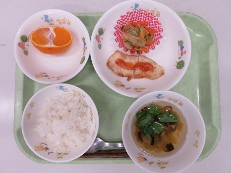 ごはん、白身魚のケチャップあん、きゅうりと大根のナムル、春雨スープ、みかん