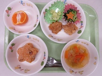 ケチャップライス、鶏のから揚げ、ブロッコリーのサラダ、こふき芋、野菜スープ、みかん