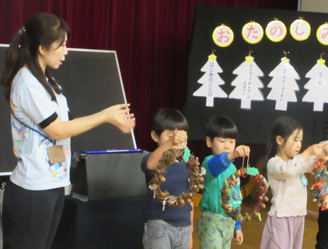 3歳児ばら組は、折り紙で作った可愛らしいクリスマスツリー。4歳児さくら組は、松ぼっくりに小さなビーズを付けたツリーと折り紙を何枚も組み合わせたリース。5歳児すみれ組は、芋ほり遠足の芋づるで作ったリースにドングリや素敵な飾りが付いたリース。