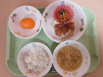 ごはん、油淋鶏(ユーリンチー)、チンゲンサイともやしのナムル、卵とわかめのスープ、みかん