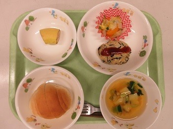ロールパン、豆腐とひじきのハンバーグ、白菜とみかんのサラダ、野菜スープ、バナナ、牛乳