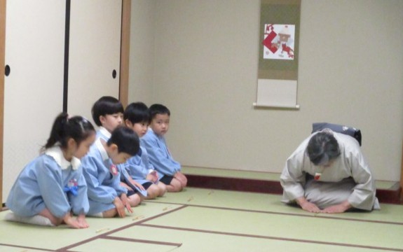 4歳児さくら組はお茶碗の扱い方を教えていただき、扇子を使ったお作法も上手にできました。