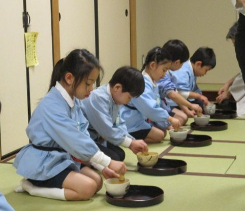 5歳児すみれ組は自分たちで点てたお茶をいただき、次回は保護者にお茶を点ててもてなす予定です。