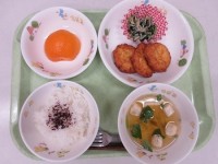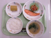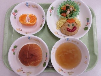 ミルクパン、鬼バーグ、大豆のサラダ、オニオンスープ、みかん、牛乳