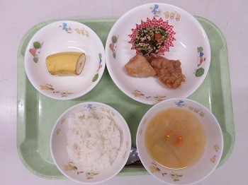 ごはん、鶏のから揚げ、明日葉の納豆あえ、みそ汁、バナナ