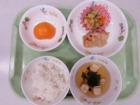 牛乳、ゆかりご飯、豆腐の落し揚げ、白菜ときゅうりの甘酢あえ、みそ汁、バナナ