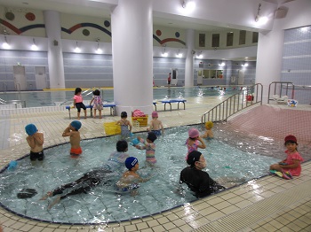 3歳児ばら組が、地下2階にある屋内プールデビューをしました!ずっと楽しみにしていた大きいプールにわくわくが止まらないばら組でした。プールの中を歩いてみたり、魚を見つけて拾ってみたりして楽しみました。