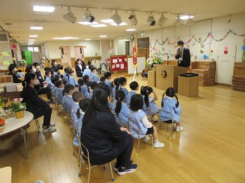 今日で令和4年度の教育課程が修了しました。3歳児ばら組と4歳児さくら組は、終業式に参加し、園長先生から修了証をいただきました。昨日の修了式をよく見ていたことで、「すみれ組みたいに賞状をもらおう!」と意識しながら修了証をもらう姿が見られました。最後はみんなで園歌を歌いました。