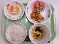 牛乳、ごはん、白身魚の竜田揚げ、大根の甘酢あえ、みそ汁、オレンジ