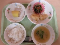 ごはん、さつま芋と鶏肉のからめ煮、もやしの甘酢あえ、みそ汁(なす・舞茸・玉葱)、梨