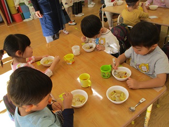 園で収穫した野菜をたっぷり使い、豚汁にしてみんなで食べました。