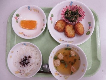 ゆかりごはん、豆腐の落し揚げ、ほうれん草のおかかあえ、すまし汁、でこぽん